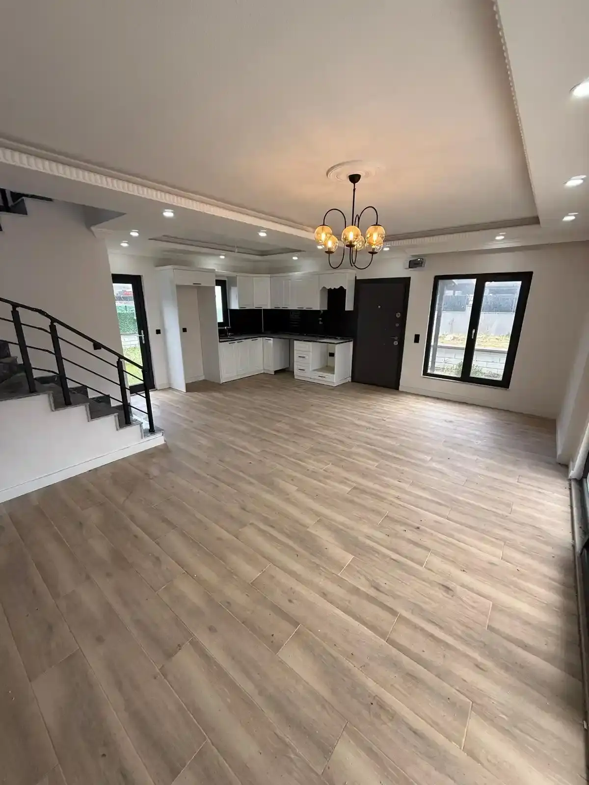 Modern İç Tasarım: Villanın tamamı şık ve dayanıklı komple laminat parke ile kaplıdır. Tavanlardaki modern asma tavan ve gizli LED aydınlatmalar (sarı ve mavi tonlarda) her odaya ferah ve estetik bir hava katmaktadır.