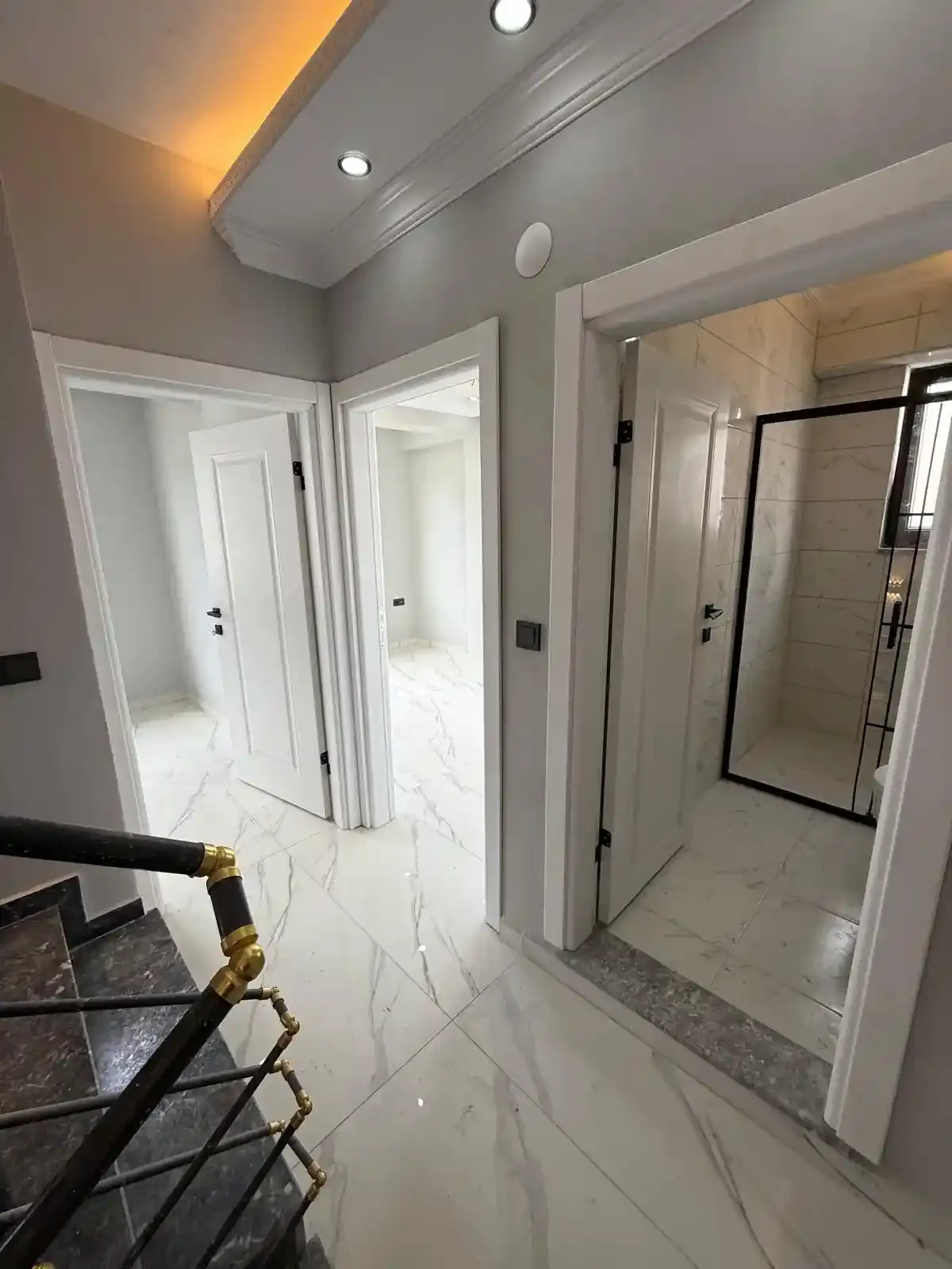 Etkileyici Aydınlatma: Salon ve odalarda asma tavan uygulamaları, gizli LED ışıklandırmalar (sarı ve mavi tonlarında) ve modern spotlar ile her odaya ferah, sıcak ve estetik bir hava katılmış. Merdiven boşluğunda da modern aydınlatma mevcuttur.