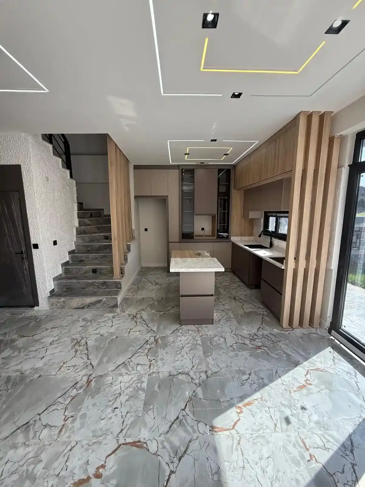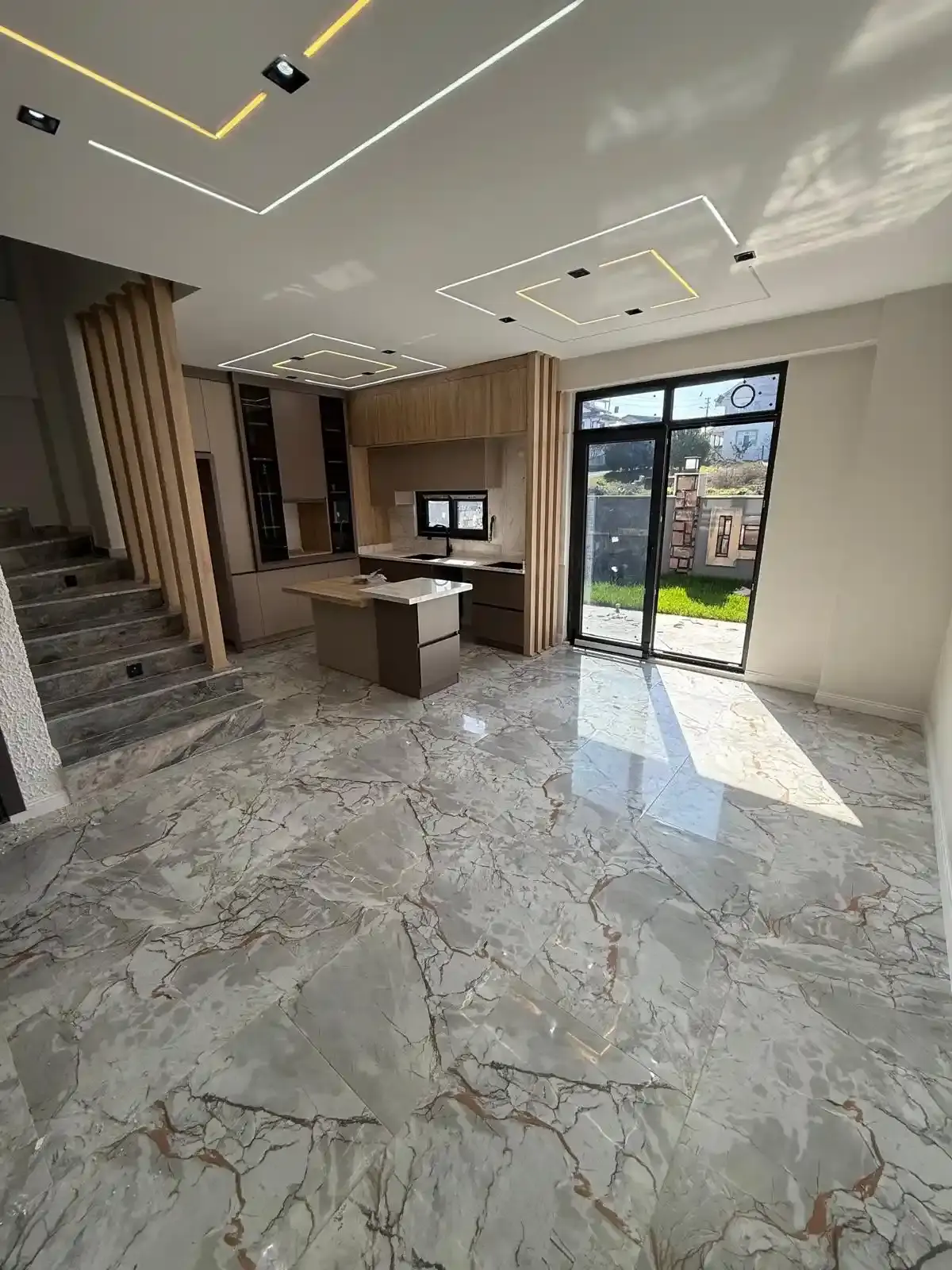 1. KAT: Modern Amerikan mutfak ve geniş oturma odası, şık niş konseptli TV ünitesi, bahçeye açılan geniş teras ve misafir lavabosu.