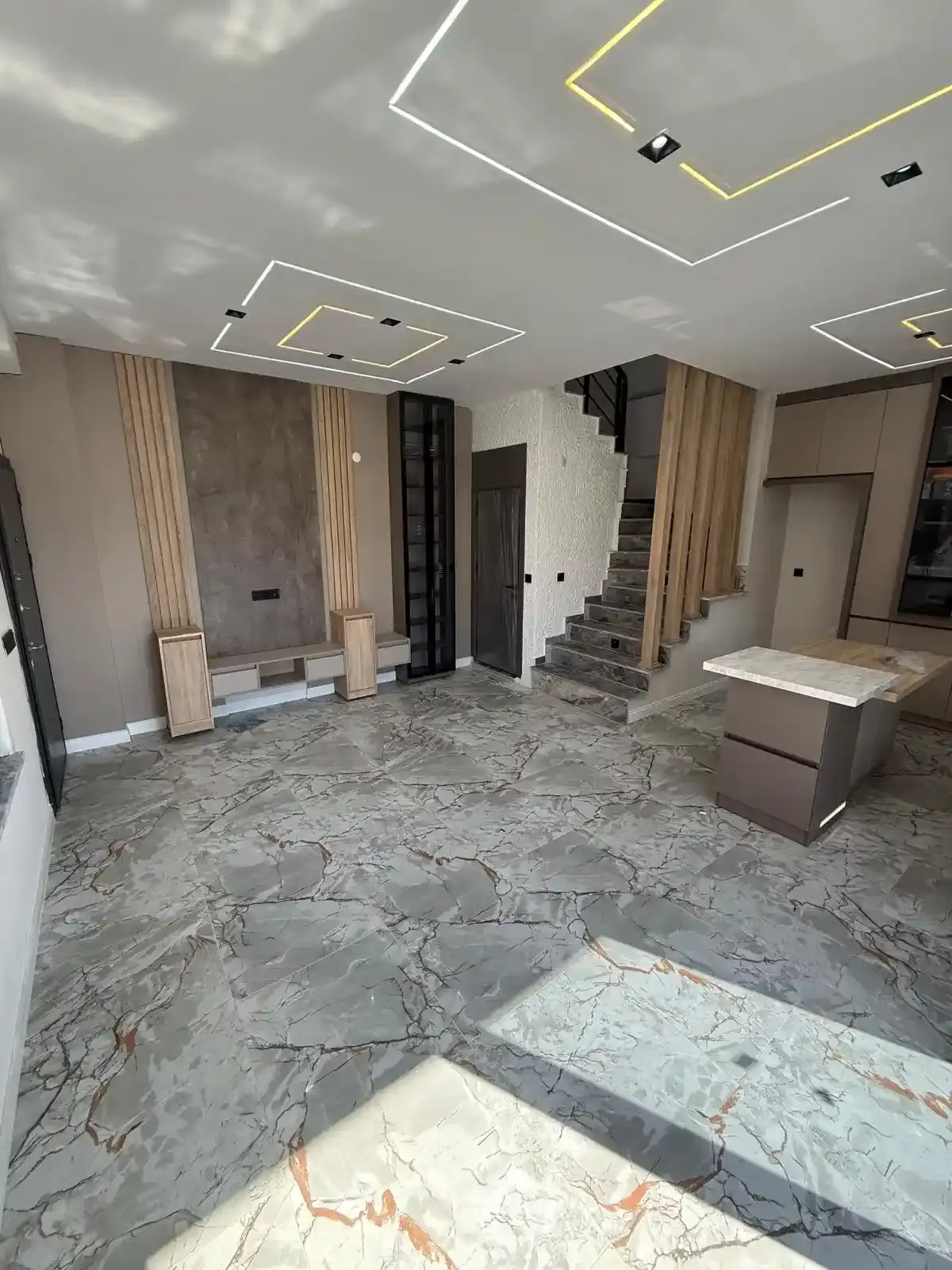 Birinci Sınıf Malzeme: Tüm zeminler 60x120 ölçülerinde lüks granit kaplama ile döşenmiş, modern ve ferah bir görünüm sağlanmıştır.