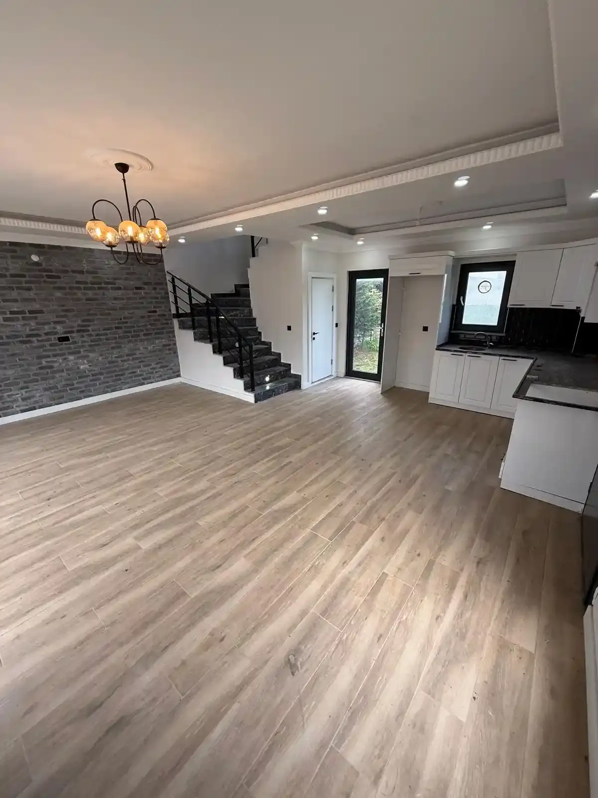 Ferah Salon ve Mutfak: Zemin katta yer alan geniş salon, bahçeye açılan büyük sürgülü kapılarıyla gün boyu bolca doğal ışık alır. Duvarında özel yapım niş konsept TV ünitesi yer alır. Amerikan mutfak, modern gri kapaklı dolapları ve beyaz tezgahıyla şık bir tasarıma sahiptir.